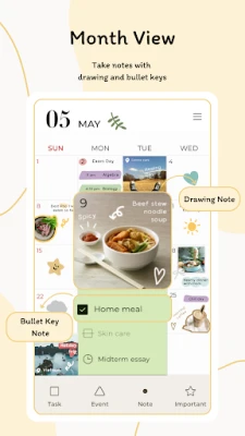 May: Beautiful Bullet Journal vam omogućuje dizajniranje osobnog digitalnog bullet dnevnika. Učinkovito upravljajte vremenom, čuvajte uspomene i pronađite inspiraciju. Dodajte bilješke, događaje, popise obveza te koristite alate za crtanje, elegantne fontove i slatke naljepnice. Prilagodite izgled s tamnom temom i 12 shema boja.