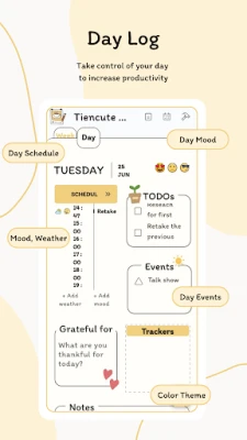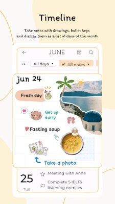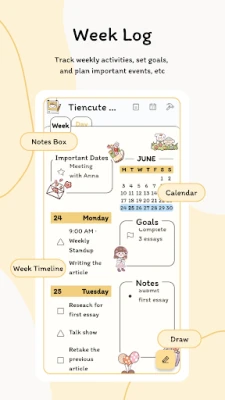 Bez obzira koristite li je kao prostor za kreativno izražavanje ili kao učinkovit digitalni alat za planiranje, ova aplikacija omogućuje vam da zabilježite sve što je važno. Brzo unosite ciljeve i tjedne zadatke, pregledavajte dnevne obaveze na mjesečnom kalendaru te bilježite sretne trenutke, nezaboravne dane i sve što volite. Skicirajte i dijelite svoje ideje s prijateljima ili obitelji bilo kada i bilo gdje. Pratite svoje raspoloženje, gradite dobre navike ili istražujte zabavne stvari poput novih knjiga i filmova. Redovito pisanje u vaš digitalni dnevnik ključno je za fokusiranje na ono najbolje u vama, zaboravljanje briga, osjećaj opuštenosti i dublje razumijevanje samih sebe. Preporučujemo da svaki dan posvetite malo vremena bilježenju i ukrašavanju – otkrit ćete mir i jasnoću u svakoj ispisanoj misli.
