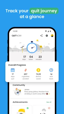 Da bi putovanje bilo lakše, QuitNow motivira kroz sustav "prekretnica". S preko 80 postignuća temeljenih na broju izbjegnutih cigareta, danima bez pušenja i ušteđenom novcu, slavite svaku malu pobjedu od samog početka. Vaše zdravlje je naš prioritet; aplikacija prikazuje poboljšanja tijela koristeći pokazatelje Svjetske zdravstvene organizacije, ažurirane u realnom vremenu. Uz to, QuitNow je opremljen naprednim alatima: "QuitNow AI" pruža pouzdane odgovore na sva vaša pitanja temeljena na našem tečaju i podacima SZO. Preporučujemo i odabranu literaturu koja nudi dodatne tehnike i perspektive. Za maksimalnu praktičnost, pratite svoj napredak i statistiku izravno sa zapešća zahvaljujući podršci za Wear OS.